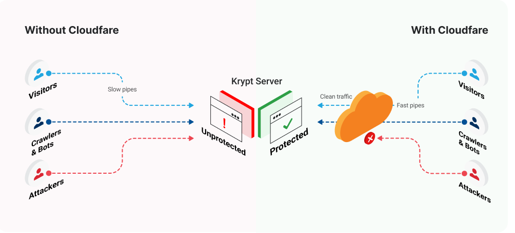 ในด้านความปลอดภัย CloudFlare มอบการป้องกันที่ครอบคลุมจากการโจมตีรูปแบบต่าง ๆ เช่น DDoS, การแฮ็กระบบ, หรือสแปมในบล็อกและฟอร์มแสดงความคิดเห็น จุดเด่นของระบบ CloudFlare คือ ยิ่งมีเว็บไซต์เข้าร่วมมาก ระบบก็ยิ่งฉลาดขึ้น โดย CloudFlare จะวิเคราะห์รูปแบบทราฟฟิกของผู้เข้าชมหลายร้อยล้านคนแบบเรียลไทม์ และปรับปรุงกลไกการรักษาความปลอดภัยให้สามารถแยกทราฟฟิกที่ดีออกจากทราฟฟิกที่เป็นอันตรายได้อย่างแม่นยำ